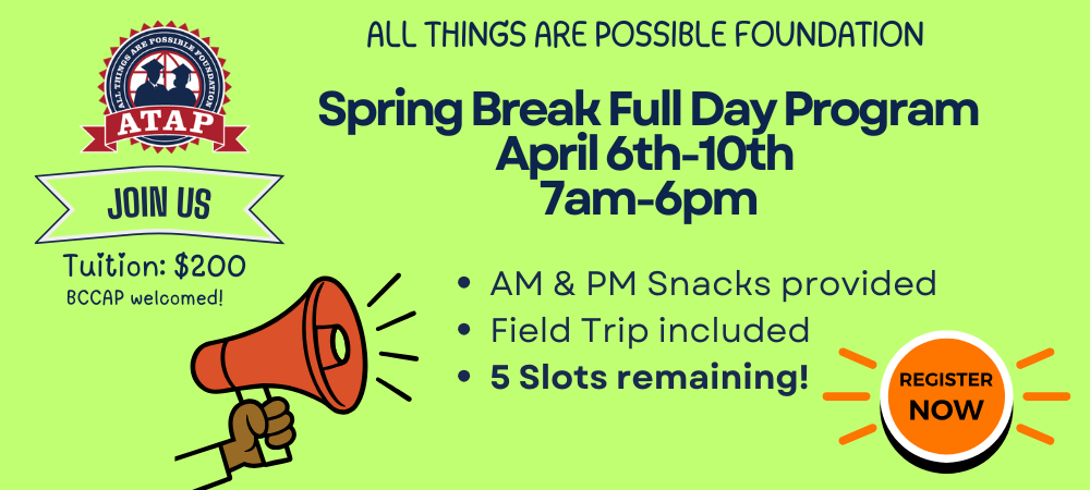 All Things Are Possible Foundation (ATAP) programs include before and after school care, full-day fall, spring, and summer programs, STEAM workshops, the performing arts, and cultural enrichment programs for K-8 and teens. ATAP is a non-profit 501(c)3 organization.